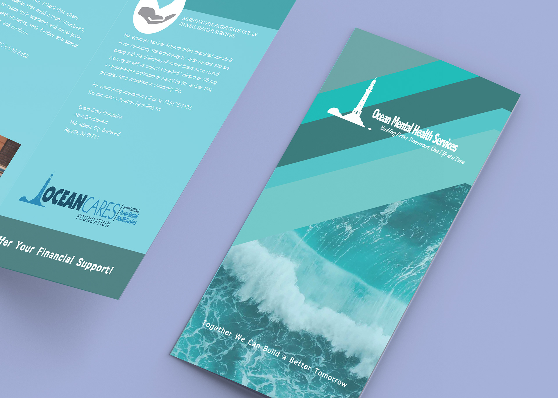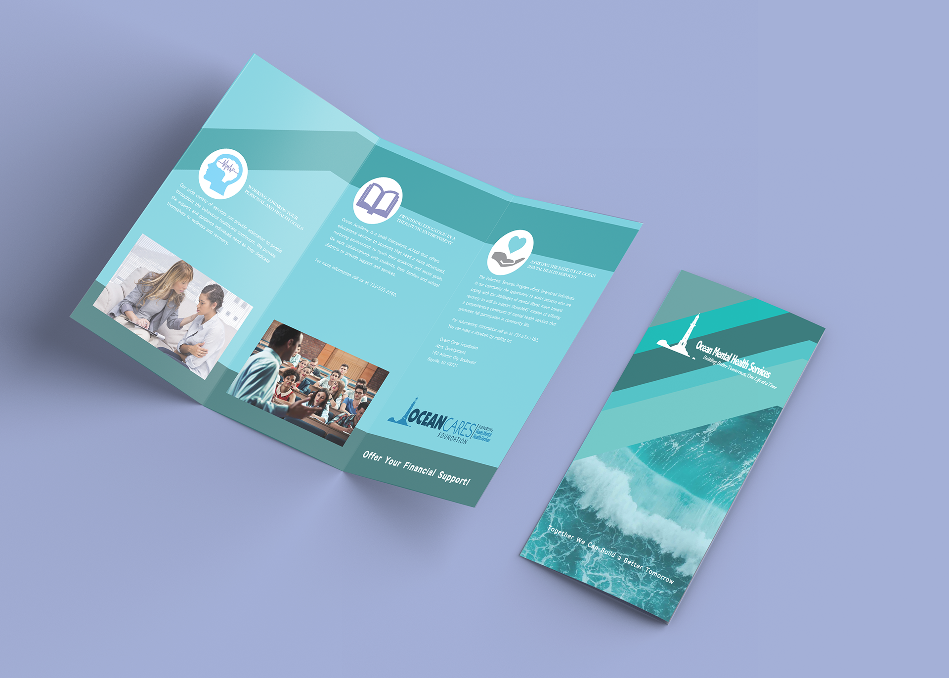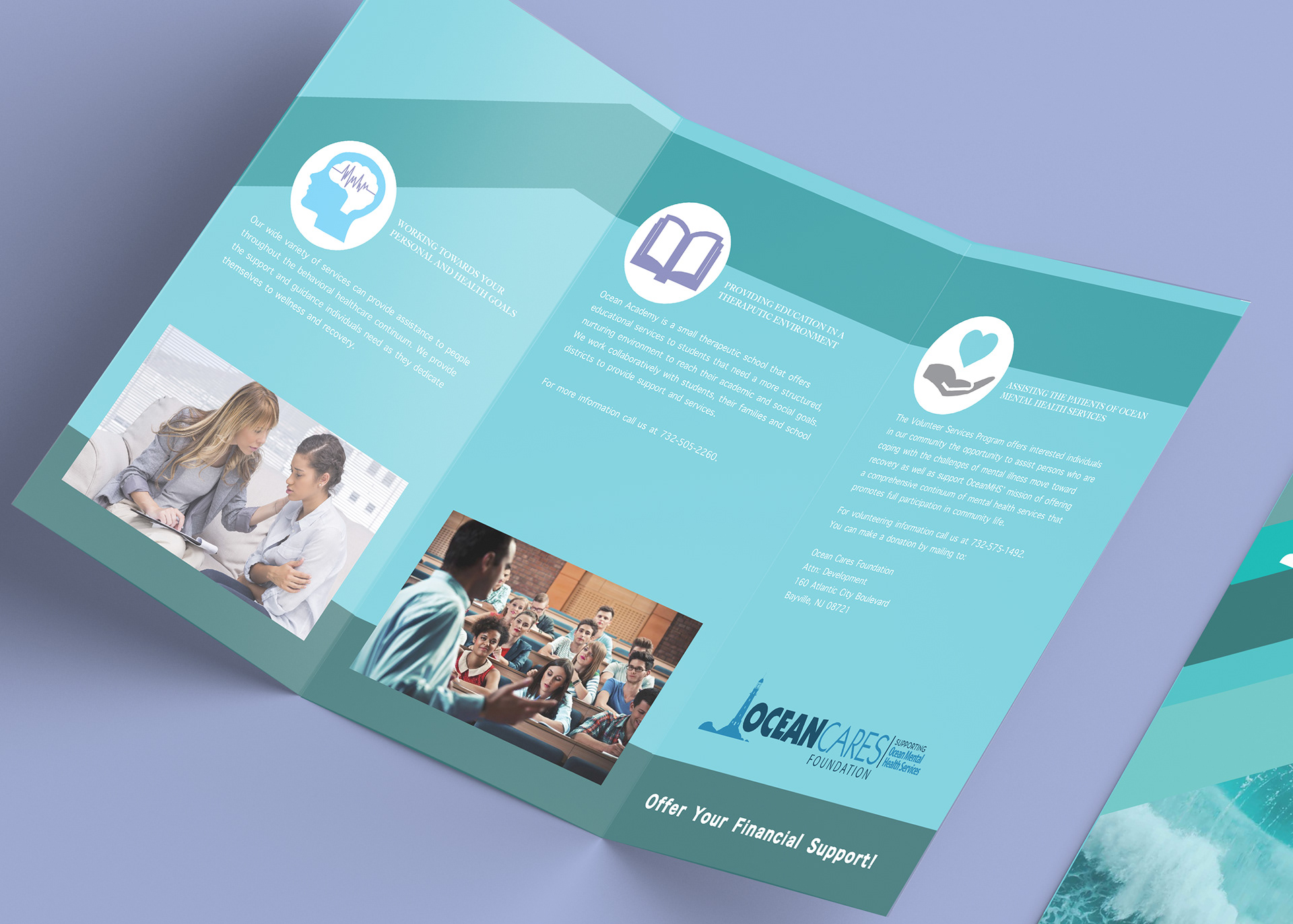 A brochure design for Oceans Mental Health Services with gentle colors and typography layout.